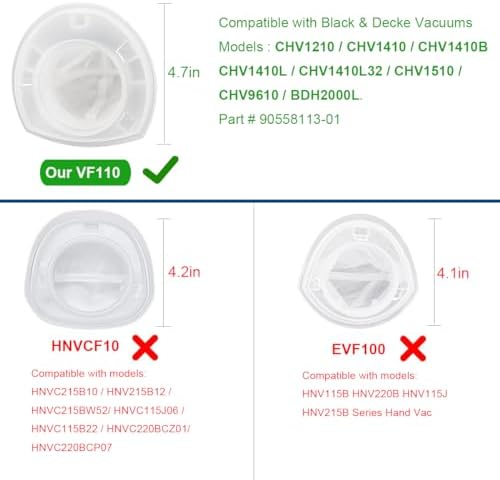 The Vacuum Filter fits for Black & Decker Hand Vac models: CHV9610, CHV1210, CHV1410, CHV1410B, CHV1510, CHV1410L, BDH2000L. Replaces part # 90558113-01. (NOT fit for HHVI315JO32 HHVI315JO42 HHVI320JR02 HHVI325JR22 HNV…series )