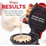 MINI IS MIGHTY: With a 4” nonstick cooking surface, this is a MUST-HAVE for that first apartment, smaller kitchen, college dorm, or camper/RV and stores easily in a kitchen cabinet or drawer.WAFFLY EASY: Simply plug it in and go; the Waffle Maker heats up in minutes. Dual non-stick surfaces provide an even cook for consistent results and delicious golden waffles every time. Nonstick surfaces make cleanup a snap.