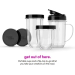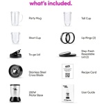 Included: (1) 250W motor base, (1) cross-blade, (1) tall cup, (1) short cup, (1) party mug, (2) lip rings, (2) Stay-Fresh resealable lids, (1) to-go lid and 10-second recipe guide.